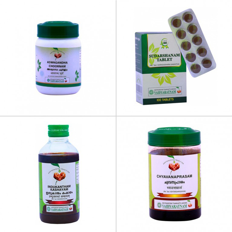 Indukantham Kashayam, Aswagandha Choornam, Sudarshanam Gulika Tablet, Chyavanaprasam